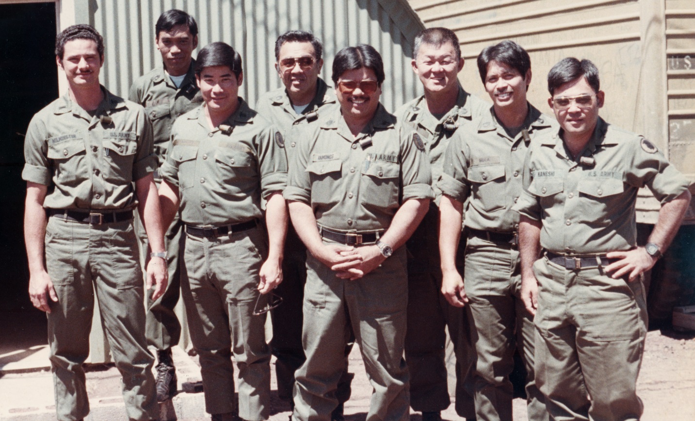 In 1981, some members of the Hawai‘i Army National Guard’s 292nd Supply & Service Company posed for a photo at the Pōhakuloa Training Area. Third from the left is then CPT Gervin Miyamoto and MAJ Emerick Kaneshi on the far right.