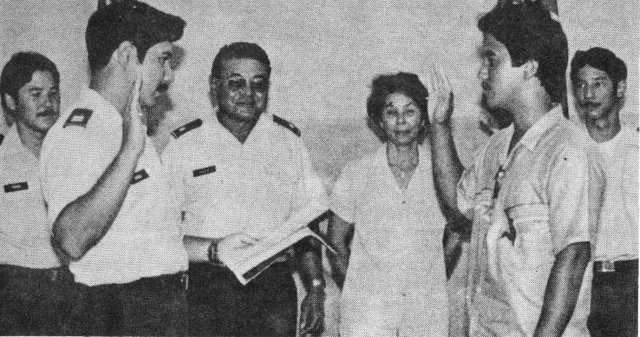 In this photo taken on May 4, 1984, then Captain Gary Hara administers the enlistment oath to his youngest brother Kenny. Kenny was 17 years old and the fourth Hara son to enter service in the Hawaii Army National Guard.