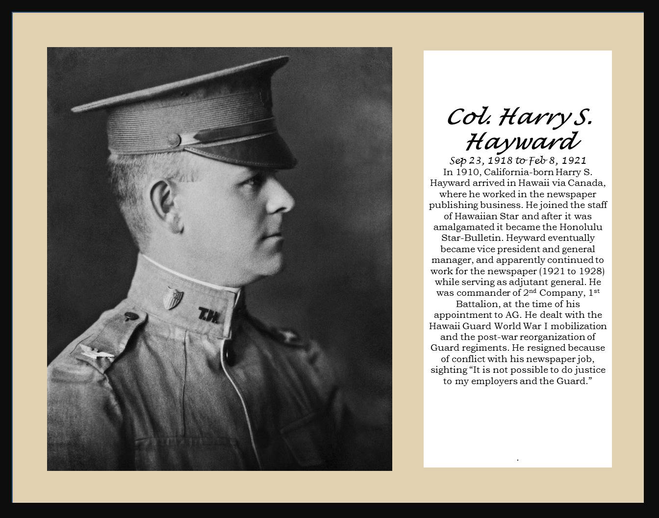 To share Steve’s hard work, we will post one of the photos each week. This week’s photo features Hawai‘i’s fifth Adjutant General, Colonel Harry Haywood.