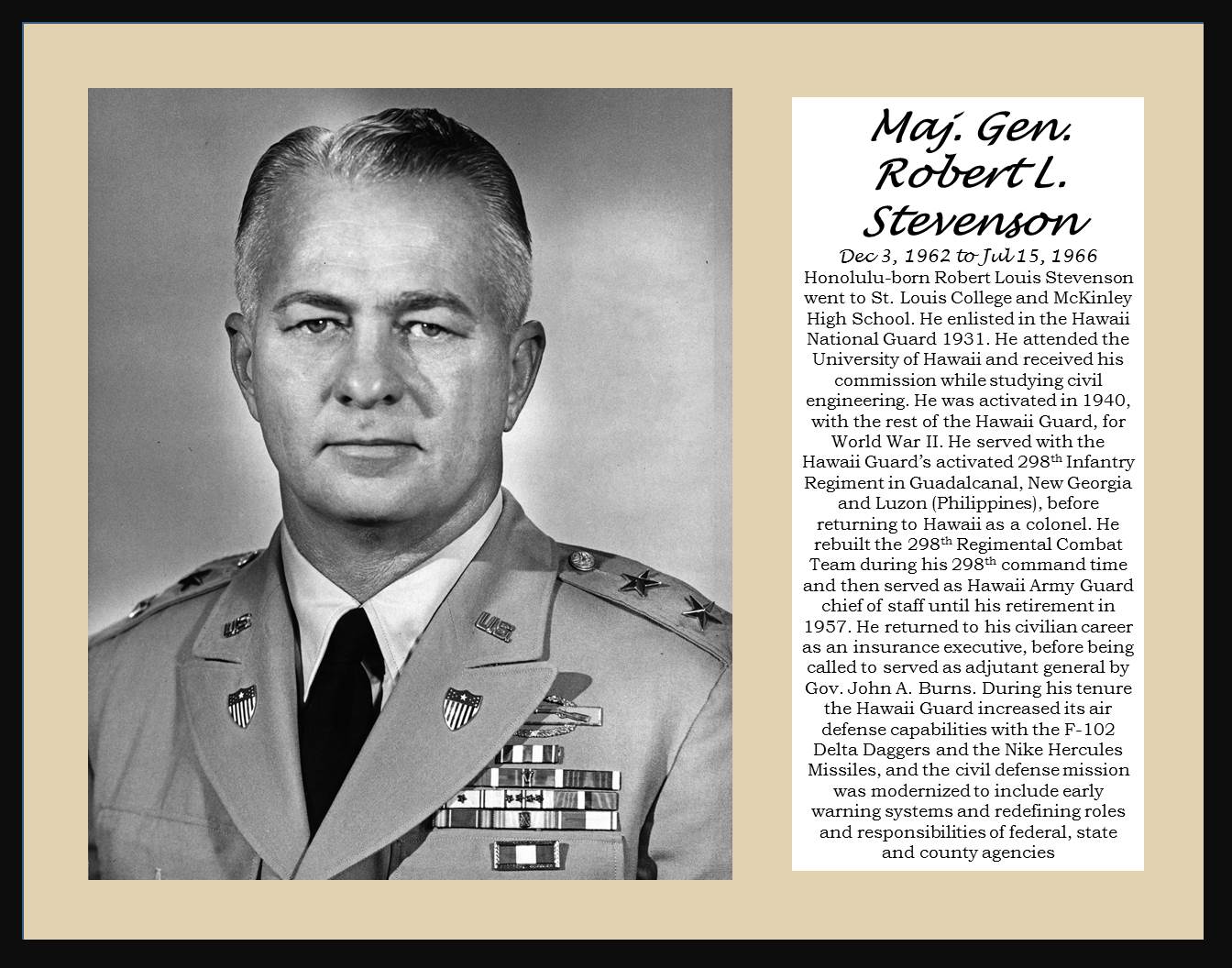 To share Steve’s hard work, we will post one of the photos each week. This week’s photo features Hawai‘i’s tenth Adjutant General, Major General Robert L. Stevenson.