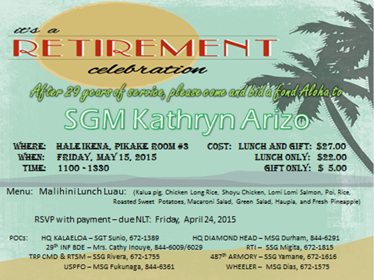 Hyperlinks. The appearance of external hyperlinks does not constitute endorsement by Retiree News of the linked web sites, or the information, products or services contained therein. Retiree News does not exercise any editorial control over the information you may find at these locations. All links are provided with the intent of meeting the mission of Retiree News – “Sharing information with Hawaii National Guard retirees, members and friends.