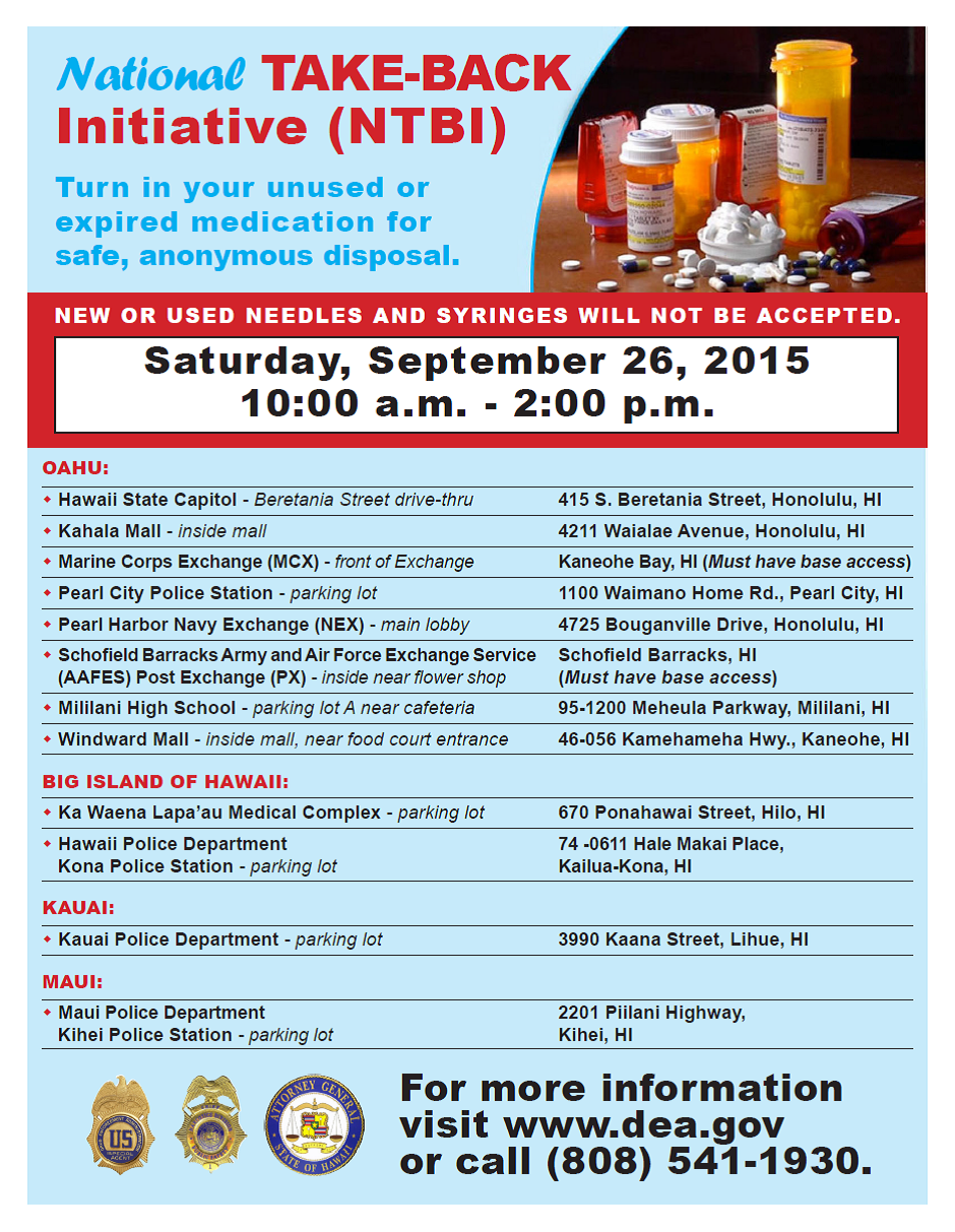 National TAKE-BACK Initiative (NTBI). Turn in your unused or expired medication for safe, anonymous disposal.