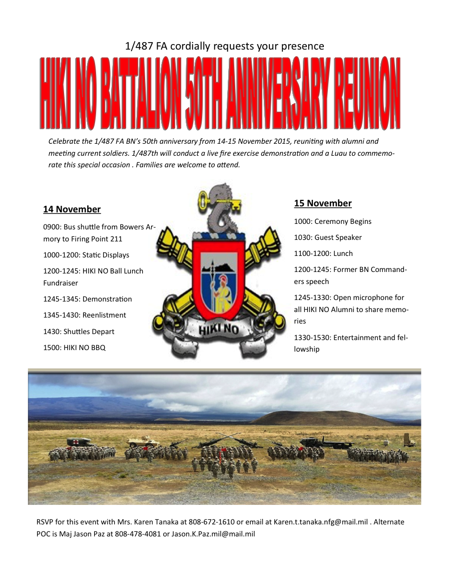 On behalf of the current 1/487FA Commander, LTC James Faleafine, we are requesting the presence of all 1/487 FA BN Alumni for the HIKI NO 50th Anniversary. The Anniversary will be held for two days; November 14 – 15, 2015. The first day will consist of a live fire demonstration using the Battalion’s latest acquisition and delivery systems. The second day will be a formal brunch to commemorate this special occasion. Former Battalion Commanders and alumni are invited to say a few words to the alumni and current soldiers of the 1/487th concerning the importance of this event, special memories or anything you feel like sharing with our HIKI NO Ohana.
