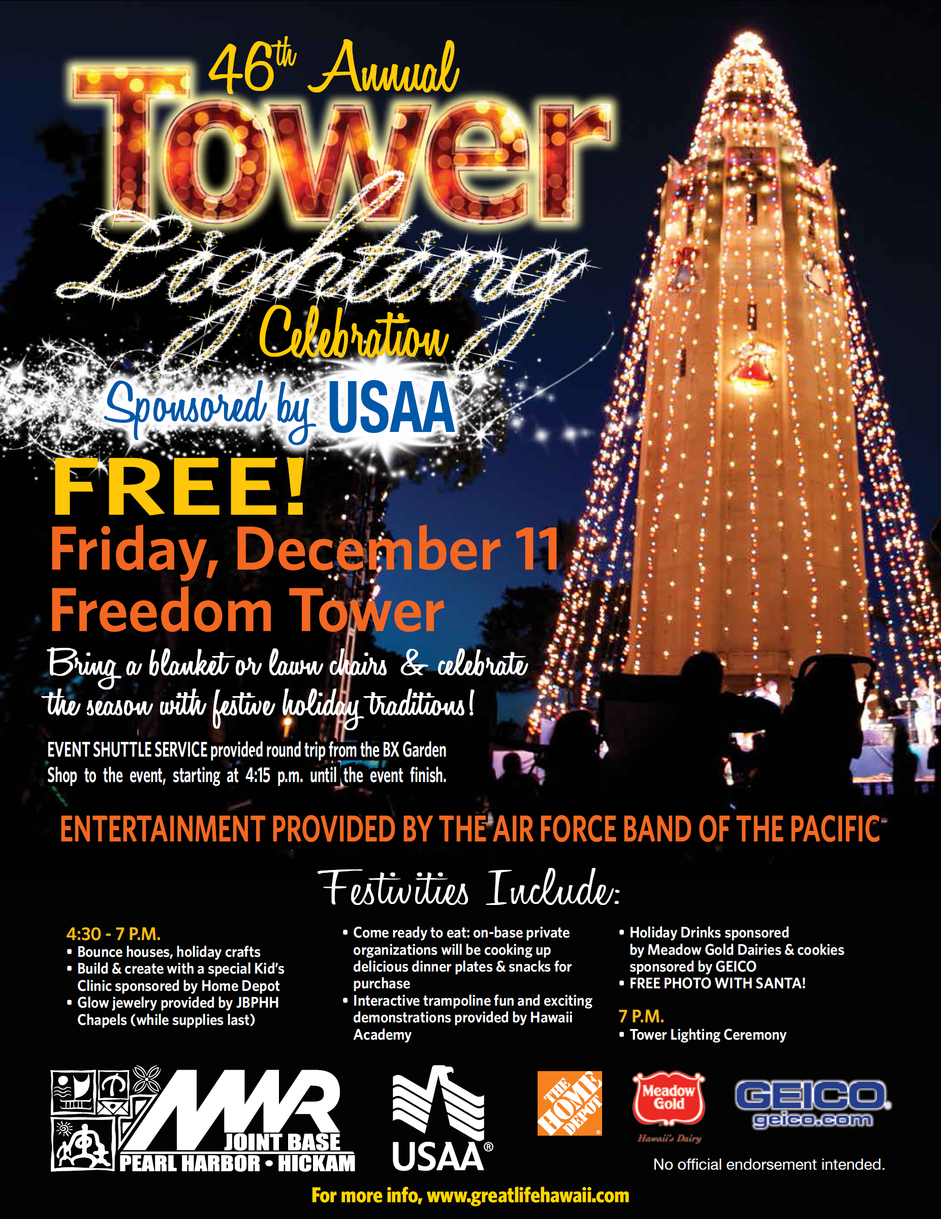 It’s time for the 46th Annual Joint Base Pearl Harbor Hickam tower lighting ceremony. The Freedom Tower ceremony will be on Friday, December 11, 2015.