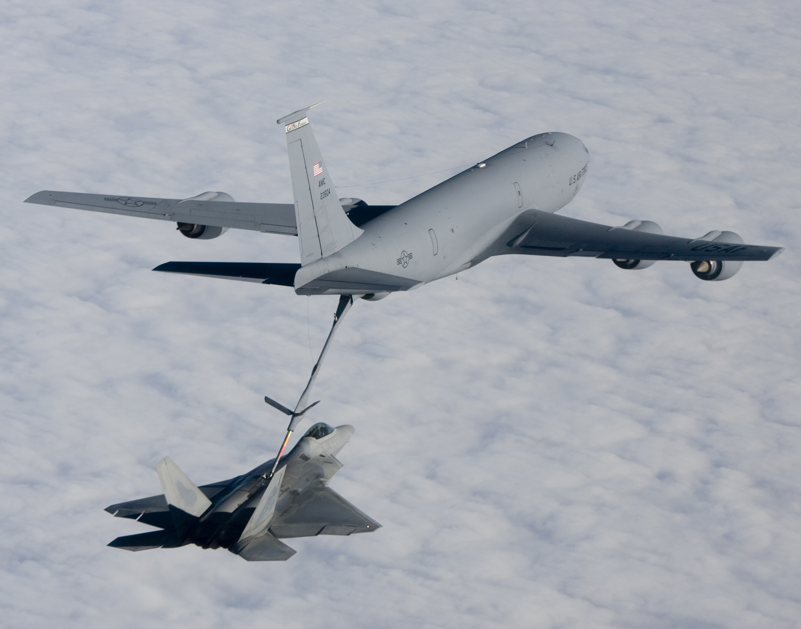 A KC-135 Stratotanker from Grand Forks Air Force Base N.D., refuels an F-22 Raptor from Edwards AFB, Calif. Jan. 18. A refueling team from Grand Forks will be the lead tanker unit at an upcoming Red Flag exercise. (U.S. Air Force photo/Darin Russell)