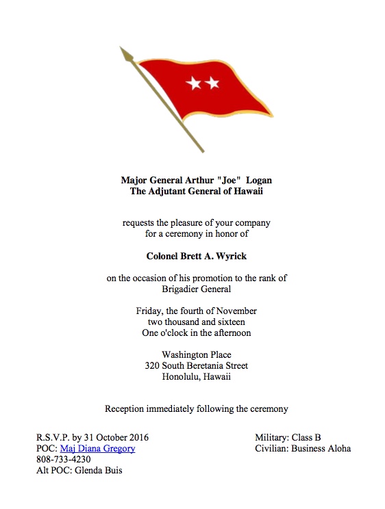 On behalf of Major General Arthur “Joe” Logan, The Adjutant General of Hawaii, you have been sent an eInvitation for the following event: