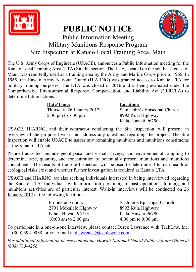 The U.S. Corps of Engineers are seeking former and retired Guardmembers who trained in the Kanaio Local Training Area (LTA) on Maui. If you served and/or trained this area, please consider sharing your knowledge to assist with the remedial feasibility study.
