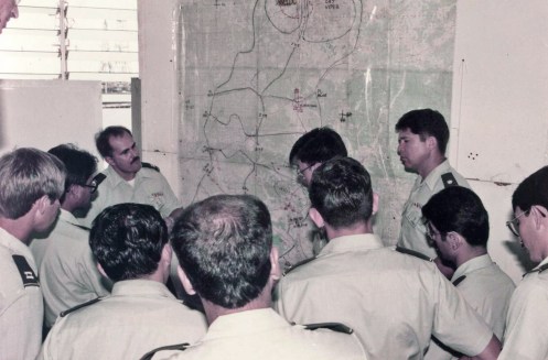 Captain Joseph Chaves and LTC Edward Correa in a mission briefing during the 1983 Tiger Balm exercise.