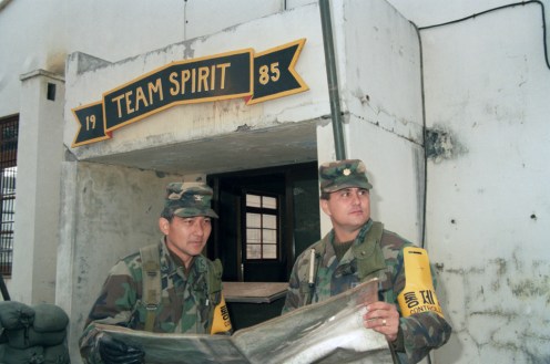 Colonel Donald Oura, Commander, 29th Brigade, Hawaii Army National Guard left, and Major Joseph Chavez discuss troop movements during the joint U.S./South Korean Exercise TEAM SPIRIT ’85. Oura is acting as the chief controller for the 1st Brigade, 25th Infantry Division, during the exercise.