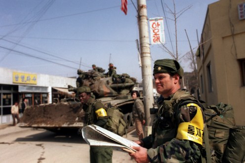 Major Edward R. Cruickshank, Commander of the 1st Battalion, 299th Infantry, Hawaii Army National Guard, observes the entry of 25th Infantry Division Orange Forces into the city, as they advance against the Blue Forces during the joint South Korean/US Exercise TEAM SPIRIT ’84. Visible to the left is an M728 combat engineer vehicle.