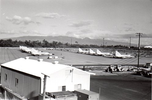 The photograph above shows the 154th Wing’s flightline around 1963/64. In the foreground is the old civil engineering building. The flightline building had not be built, and surrounding the tarmac, barely seen, is the earthen berm.