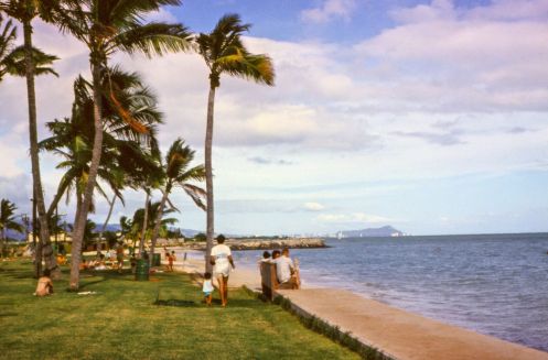 This photograph shows the view from the Hickam Beach, near the old Golden Anchor – now the Lanai at Mamala Bay. Diamond Head is at the horizon. The photograph is dated 1967.