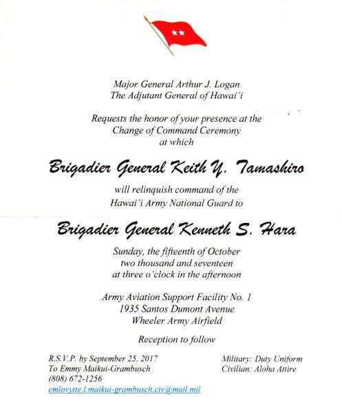 Army Aviation Support Facility No. 1 (AASF 1), Change of Command (CoC), Hawaii Army National Guard (HIARNG), History, Keith Tamashiro, Kenneth S. Hara