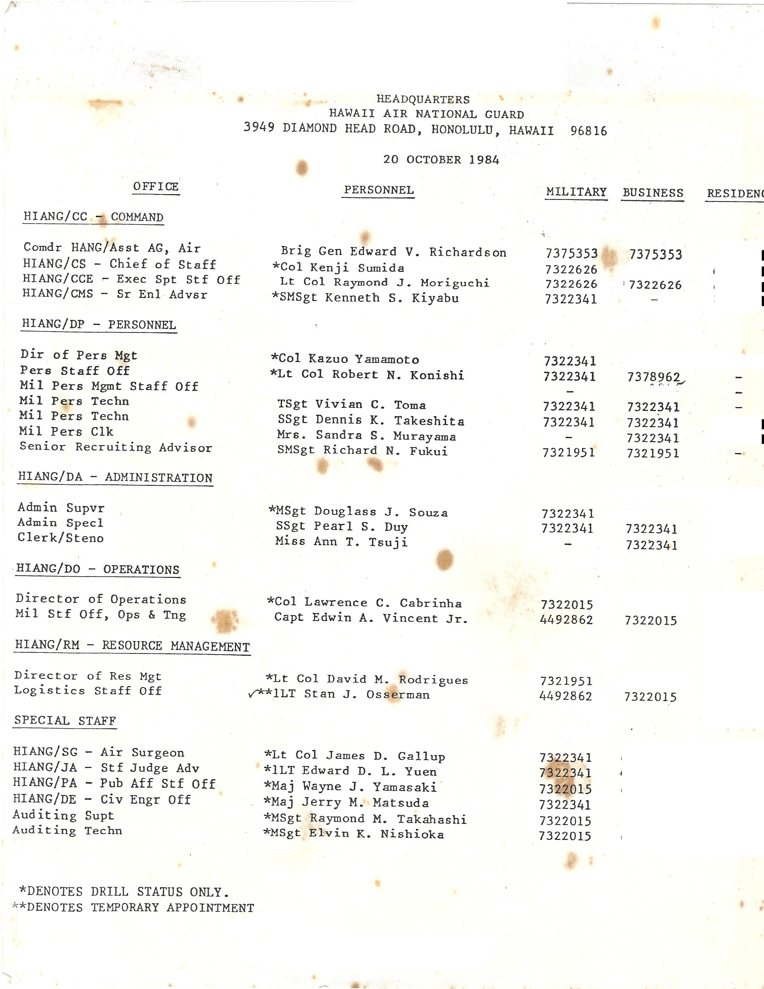 Stanley Osserman recently shared some old documents from his personal files with Retiree News. One of those documents was this 1984 telephone roster from the Headquarters, Hawaii Air National Guard.