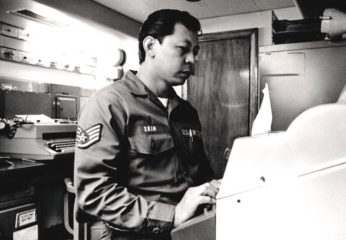 Roland Shim, 202d Combat Communications Flight (later the 293d Combat Communications Squadron), types a message on a teletype unit. Existing facilities were tasked for support of the Team Spirit 80 exercise. In addition to manning field communications sites, deployed Guardmembers augmented Air Force personnel in permanent facilities like Osan AB.
