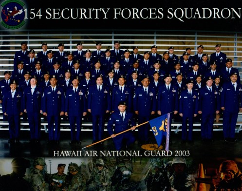 In February 2003, the 154th Security Forces Squadron had a service dress uniform check and later lined up for a great unit photograph. Wayne Acosta was the unit commander and Ray G. Duropan was the senior technician.