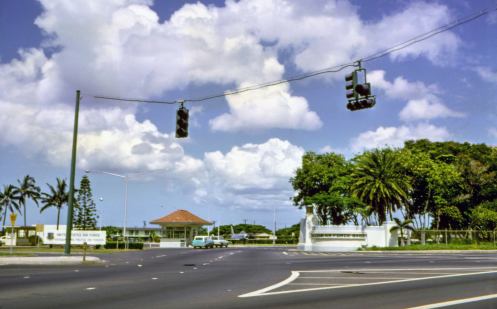 The front gate at Hickam Air Force Base, now Hickam Field on Joint Base Pearl Harbor-Hickam, has evolved from it’s beginning in 1935. The constant has been the Art Deco design front gates.