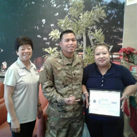 Judith Tomas, supervisor for Max’s Restaurant, Maui was presented with a Patriot Award December 11 in recognition of her continued support provided to Specialist Manuel Soco, a Hawaii Army National Guard soldier. The award was presented by ESGR volunteer Donna Shimizu.