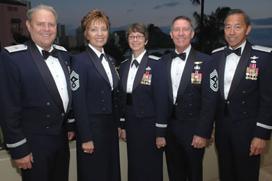 In November 2006, the Hawaii Air National Guard to celebrate 60 years of excellence, protecting Hawaii and the nation. In the photograph (L-R): Peter “Skipper” Pawling, Denise Jelinski-Hall, Kathleen Berg, Kent Billings and Darryll Wong.
