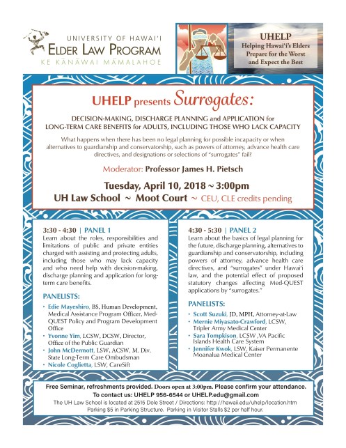 The William S. Richardson School of Law will host another seminar on Tuesday, April 10, 2018. This seminar will focus on surrogate decision-making. This may be of special interest to doctors, lawyers and social workers but consumers may also find it interesting since most patients still do not plan ahead for incapacity with such important documents as advance health care directives and powers of attorney. Review the flyer below for more information.