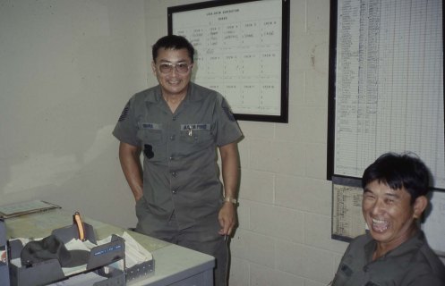 This undated photograph shows Kenneth Iinuma and Randall Lum of the Weapons Shop. Based on the uniforms and ranks, the photograph was taken in the late 70s or the early 80s.