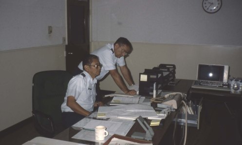 This photograph shows MSgt Rudy Luat (sitting) and Lt Col Norman Ault reviewing maintenance records. Rudy was the NCOIC of the Maintenance Control Section and Norman Ault was the Chief of Maintenance and the commander of the then 154th Consolidated Maintenance Squadron.