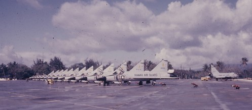 We estimate this photograph was taken in the early 1960s. The 199th Fighter Squadron received the Deuces in late 1960 and started flying them in 1961. The aircraft shown have “Hawaii Air Guard” markings. There are photographs dated 1964 showing Deuces with “U.S. Air Force” markings.