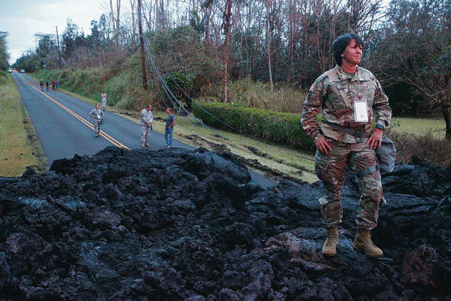 Leilani Estates continued to suffer the ravages of Pele on Friday near Pahoa, Hawaii. Army National Guardsman Chief Warrant Officer Kandee Almond stood atop a lava flow on Leilani Avenue.