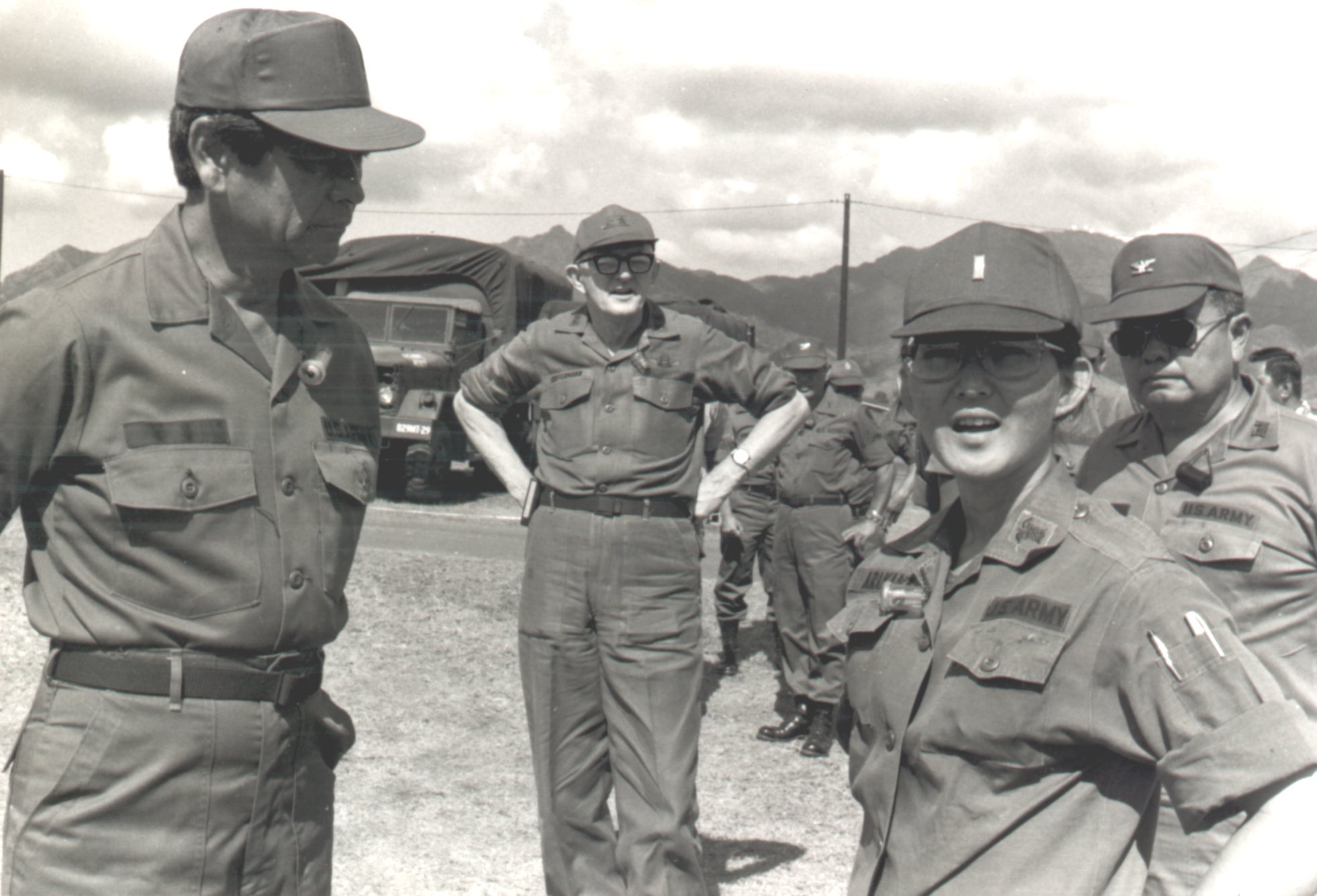 This undated photograph shows Governor George Ariyoshi in his visit to the Hawaii Army National Guard during annual field training. In the photograph is (L-R): Governor Ariyoshi, Adjutant General Maj Gen Valentine Siefermann, then Lieutenant Clara (Arakara) Furabayashi, then COL Alexis Lum.