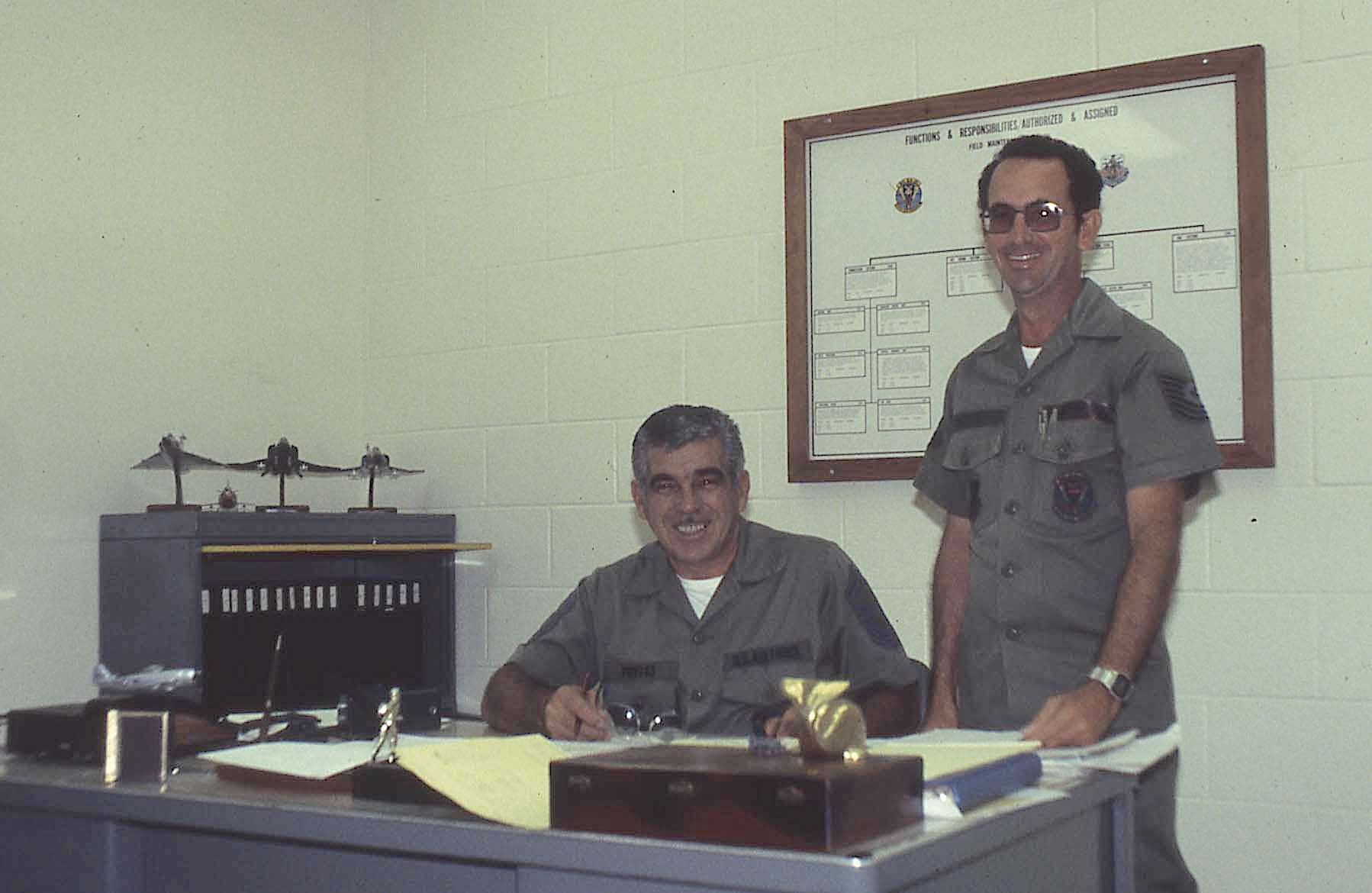 This undated photograph show CMSgt David Pontes and then-MSgt Larry DeRego. Both were part of the supervisory team in the 154th Consolidated Aircraft Maintenance Squadron. Chief Pontes retired and relocated to the Northwest where he later passed. Larry DeRego retired as Chief capping a long military career.