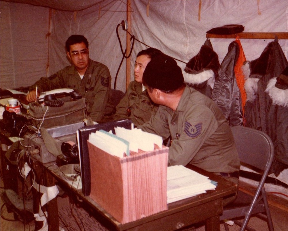 The 201st Combat Communications Group deployed to the annual Team Spirit exercises in Korea. The 201 CCG units augmented the existing communications system and setup communications on exercise bare bases. This photograph shows (L-R) Toshi Nagai, the then-297th Air Traffic Control Flight; Gregory Ing, the then-201st Combat Communications Flight, and an unidentifed airman. There is even a hand crank field telephone in front of Greg.