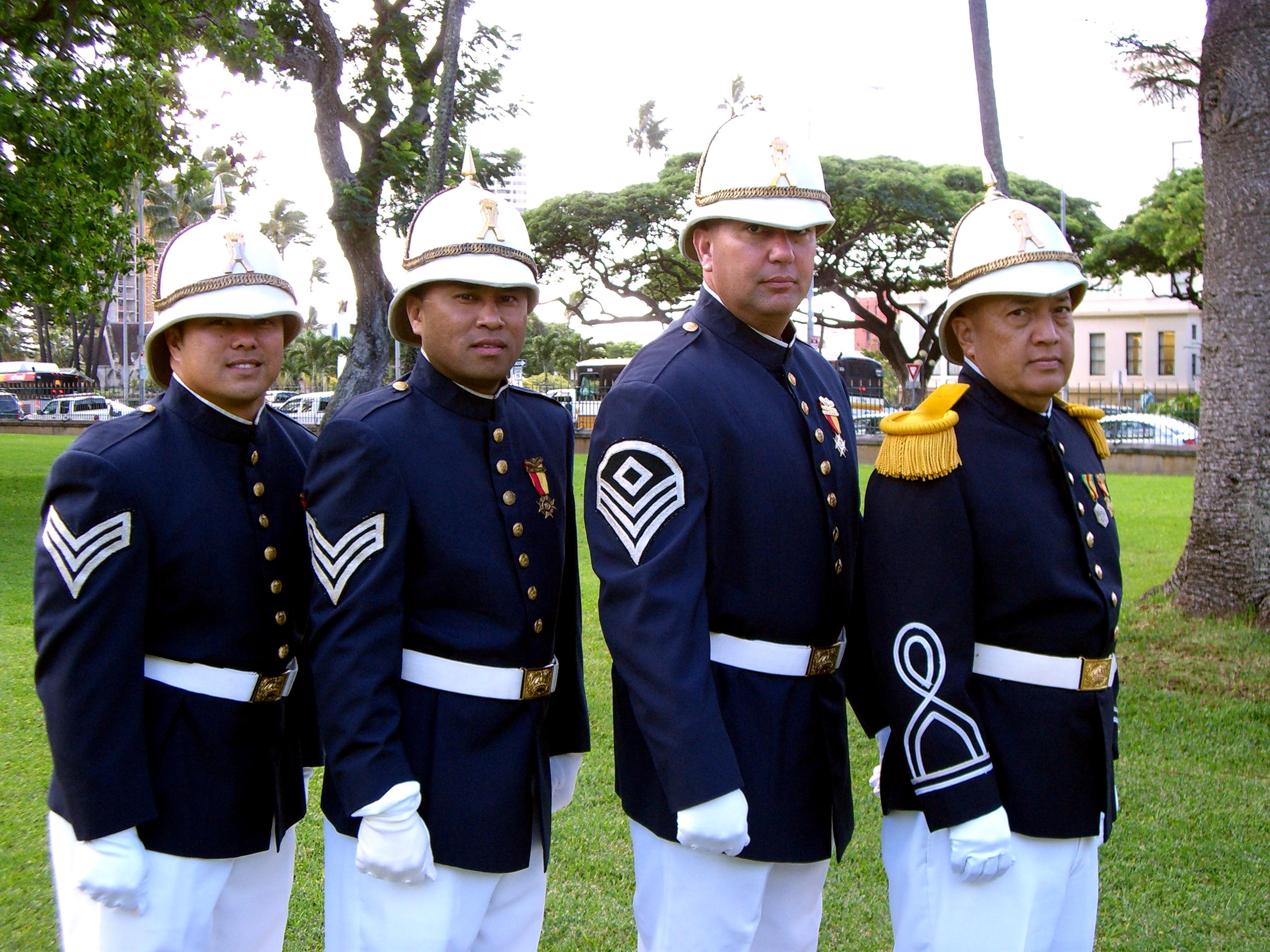 In the photograph are Franklin Ho, Darryl Bactad, Gary Hema, Norton Molina. Frank and Darryl were sergeants, Gary was the First Sergeant and Norton was the Kapena Moku (captain).