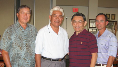 On February 27, 2010, there was a retirement party for Colosse Eliapo at the Navy Marine Course. Attending were many of his family, friends and co-workers. In this photograph shows (L-R) Alwyn Yoshimura, Colosse, Galen Yoshimoto and Duke Ota.