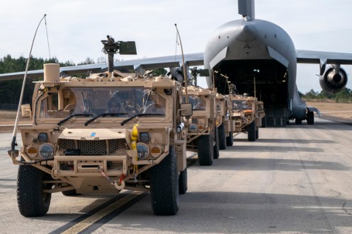 U.S. Army Soldiers and vehicles from the 3rd Special Forces Group prepare to board a Hawaii Air National Guard C-17 Globemaster III January 21, 2019, at Camp Shelby Joint Forces Training Center near Hattiesburg, Mississippi. The 204th Airlift Squadron transported personnel and vehicles to the, Miss., during exercise Southern Strike. The annual training is a is a total force, multi-service exercise hosted by the Mississippi Air National Guard’s Combat Readiness Training Center in Gulfport.