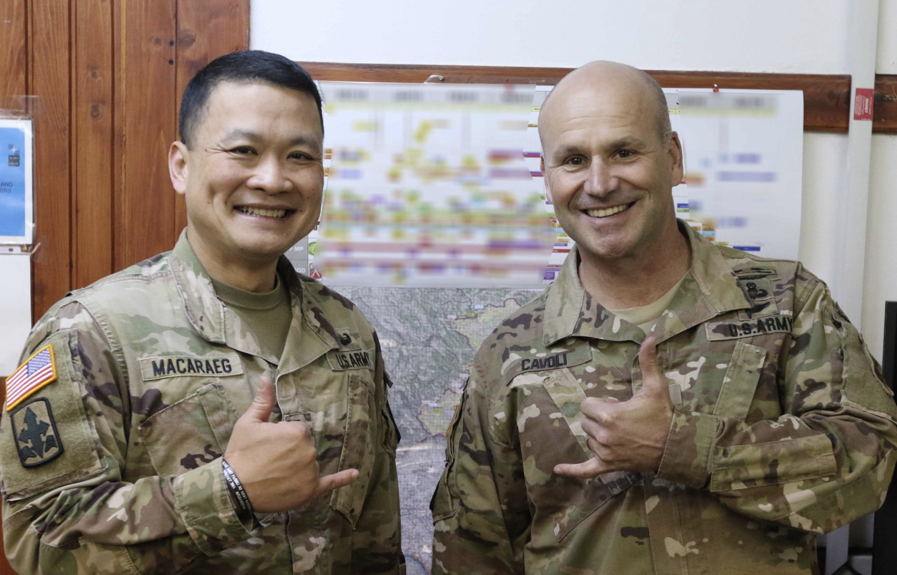 This is just Multinational Battle Group-East (MNBG–E) Commander Colonel Roy Macaraeg “shaka-ing” with U.S. Army Europe Commander, Lt. Gen. Christopher G. Cavoli. LTG Cavoli visited MNBG-East Solders on Camp Bondsteel, Kosovo, February 1, 2019.