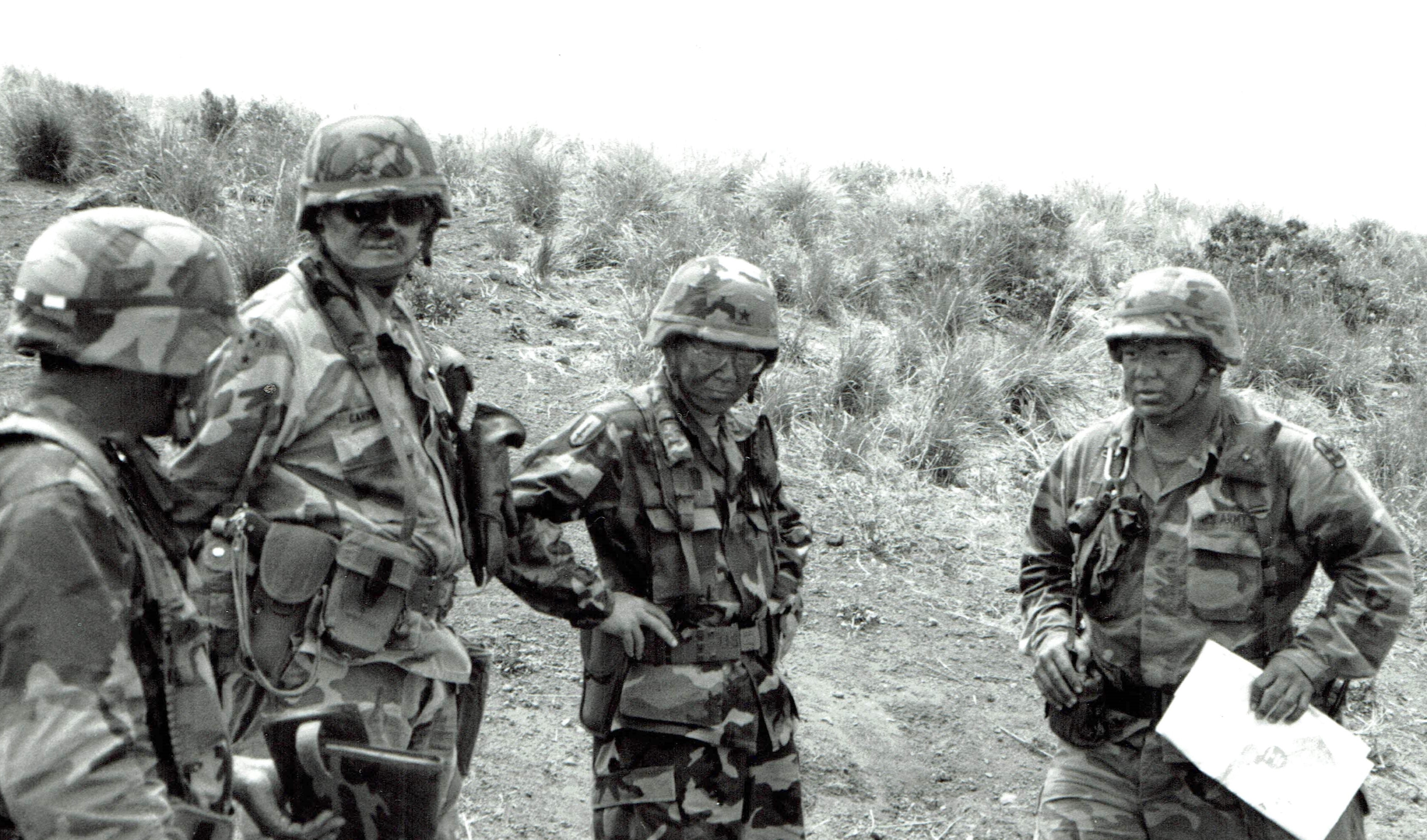 This photograph shows (L-R): unidentified soldier, then-LTC James Carpenter, Commander of the 1st Battalion – 487th Field Artillery (1-487FA), then-BG Eugene Imai, Assistant Adjutant General, Army/Deputy Commander, State Area Command, and then-SGT Colbert Helemano (Fire Support Specialist). SGT Helemano was updating the commanders about the fire base setup.