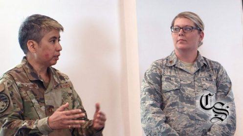 Air Force Capt. Kelly Machado and Maj. Amanda Hill outline the military training purpose behind the Innovative Readiness Training program coming in July to Cortland County. More than 400 military medical providers will provide free health and dental care, the second-largest such program in America this year, behind efforts in Puerto Rico. | Todd R. McAdam photograph