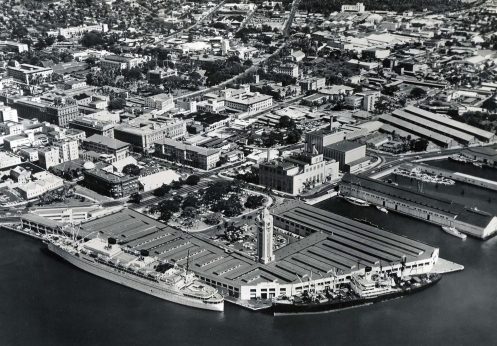 If you enlarge the photograph, you will see several buildings that are still part of the Downtown Honolulu landscape today – Aloha Tower, the Hawaiian Electric power plant, ‘Iolani Palace, City Hall, and Kawaiahaʻo Church