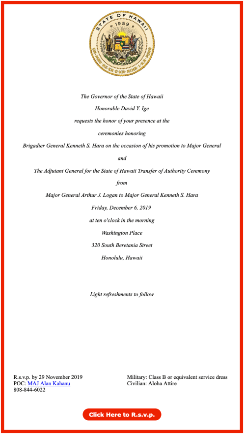 Adjutant General, Arthur "Joe" Logan, Kenneth S. Hara, promotion ceremony, Transfer of Authority, Washington Place