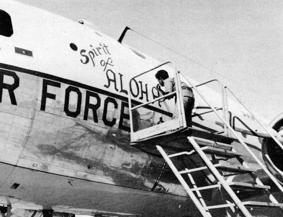During 1967, there was a contest to name the C-54. TSgt Wayne Soma won with his suggestion “Spirit of Aloha“. after going through the approval process, then-TSgt Rex Koga painted the name on the C-54 later that year. (HANG 25 Booklet)