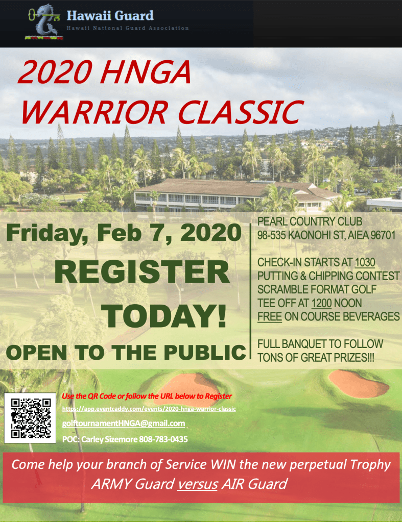 The Hawaii National Guard Association will host its annual golf tournament – the 2020 HNGA Warrior Classic – on Friday, February 7, 2020. The flyer above lists information about the tournament.