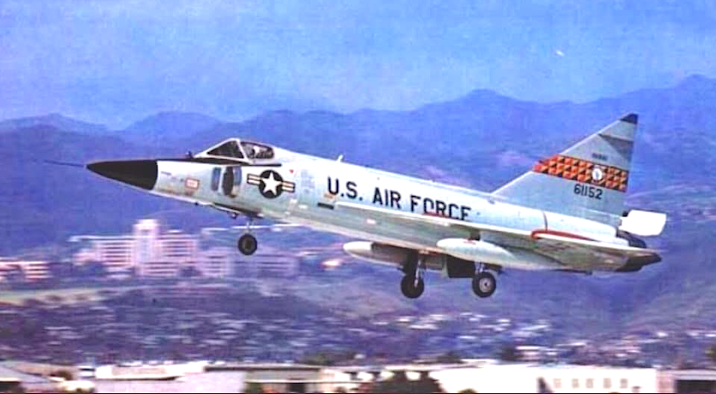This a photograph shows a F-102 Delta Dagger landing on Runway 26R at then-Honolulu International Airport.
