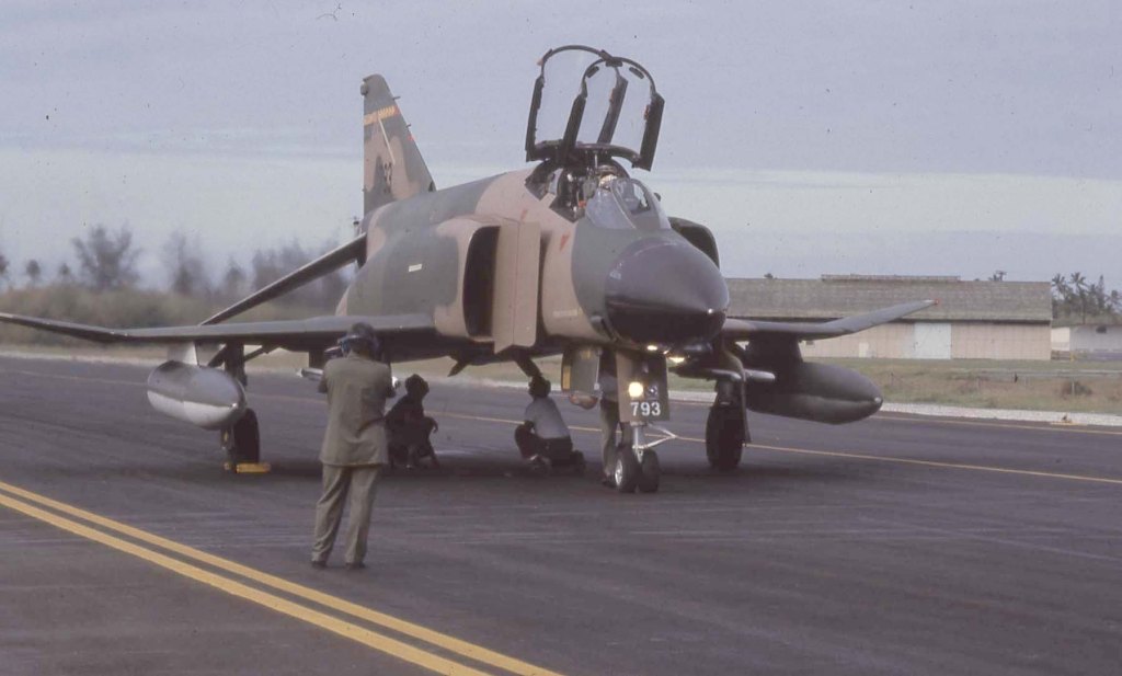 This undated photograph shows a Hawaii Air National Guard McDonnell Douglas F-4C Phantom on Taxiway Mike. Aircraft leaving on training flights get an engine running last check at the end of Taxiway Mike prior to takeoff.
