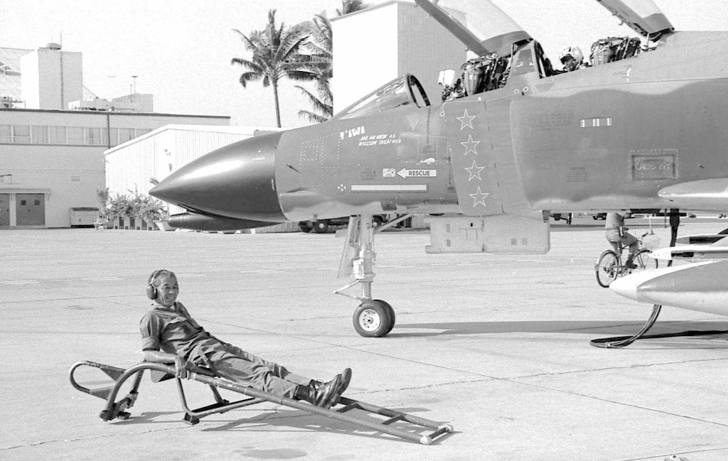 This undated photograph show James Suzuki taking a break on the flightline as the aircrew completes their preflight checklist.