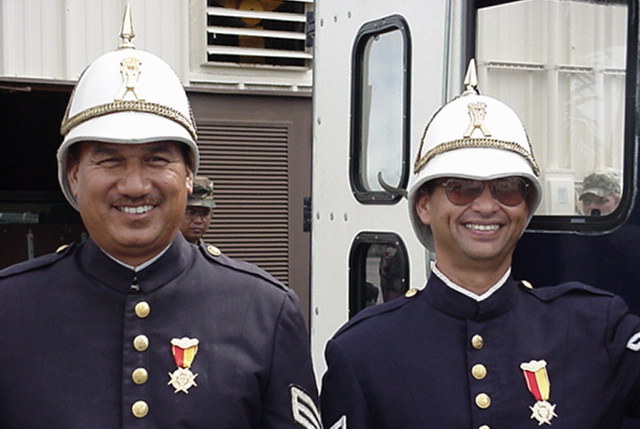 This photograph shows Royal Guard members Norman Kaleo and Raymond Vegas. Both served for many years as members of this elite organization.