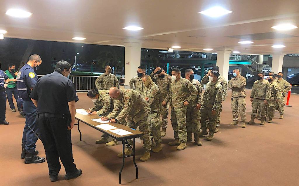 Every morning at 6:30AM Monday thru Saturday a dedicated crew of personnel including members of the Honolulu Fire Department, Honolulu Police Department, Hawaii Army National Guard, and Kahu Malama Nurses gather at the Neal S Blaisdell Center for their morning briefing before heading out to set up and staff the City’s COVID-19 testing sites.