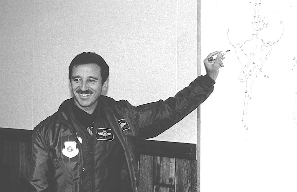 This photograph shows Harold “Shaka” Schatz briefing fighter tactics. It appears to be during the F-4 Phantom era. Shaka flew F-102 Delta Daggers, F-4s and F-15 Eagles.