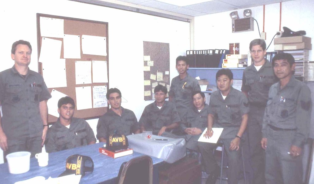 This mid-1980s photograph shows members of the inertial navigation system (INS) shop. In the photograph are (L-R): Jimmy Williams, Mark Mendez, Darryl Chun Fat, unknown, Edward Sugai, William Takata, unknown, unknown, George Kaneshiro.