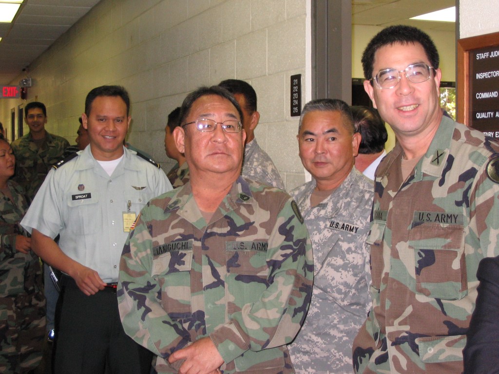 The State Department of Defense annually host a Christmas tree decorating event. This photograph was taken on December 9, 2005 and features Jared Sproat, Paul Taniguchi, Vernon Nakasone, and Brooks Akana.