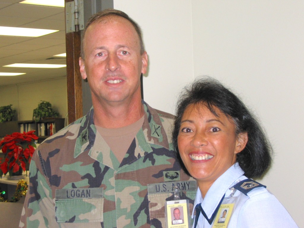 The State Department of Defense annually host a Christmas tree decorating event. This photograph was taken on December 9, 2005 and features Mark and Blossom Logan,